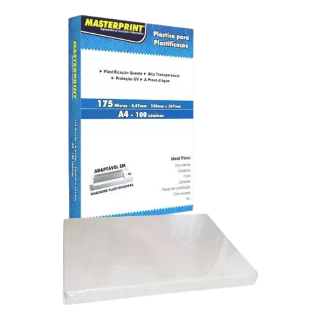 Filme plástico para plastificação tamanho A4 (220x307mm), espessura de 0,07mm (175mic), da marca MasterPrint. Com cantos arredondados e embalagem contendo 100 unidades, este filme oferece um acabamento perfeito e resistência à água para proteger seus documentos. Ideal para diversos trabalhos como comunicados, cardápios, fotos e certidões. Proteja seus documentos com qualidade e praticidade com o filme para plastificação MasterPrint.
